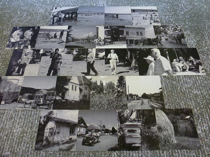 Ebenfalls wie Pflastersteine arrangiert, finden sich im oberen Teil des weißen Feldes quadratische Schwarz-Weiß-Fotos. Sie zeigen Menschen und Lebenssituationen aus verschiedenen Ländern Osteuropas.