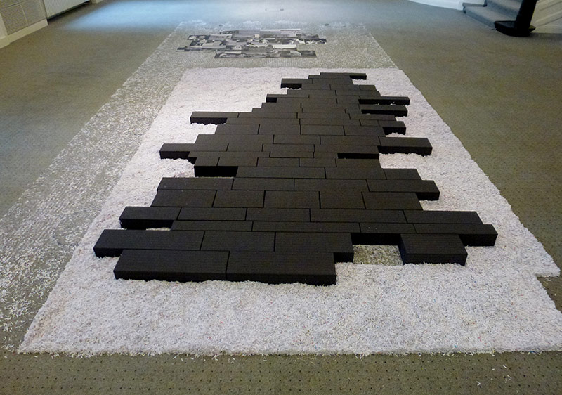 Eingebettet ist dieser Weg in ein dichtes, weißes Feld aus ‚pulverisiertem‘ Papier, das der Form eines Rechtecks folgt. Im unteren rechten Bereich dieser Fläche befindet sich eine Aussparung, im linken und oberen Teil des Rechtecks löst sich die Struktur dieser weißen Fläche auf und wird transparenter.
