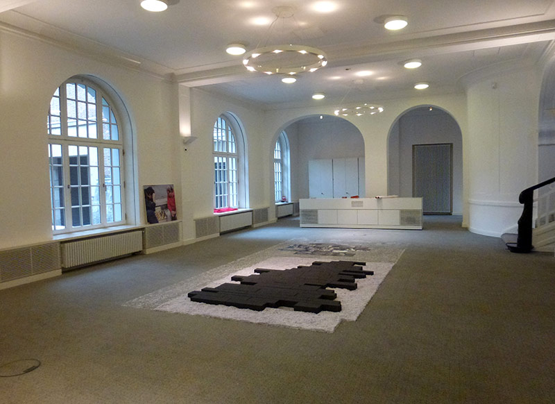 Holzkästen - in unterschiedlichen Abmessungen, überzogen mit grauem Nadelstreifen-Stoff. Ähnlich Pflastersteinen, auf dem Boden eng arrangiert, deuten sie einen Weg an, der sich einerseits in einer massiven Fläche manifestiert, sich andererseits zu den Rändern hin auszulösen scheint.