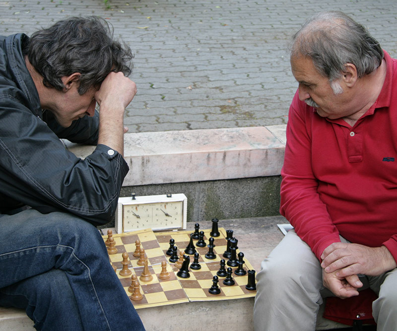 Außerhalb der Bodeninstallation steht an der linken Wand ein Farb-Foto, das zwei Männer beim Schachspielen zeigt.