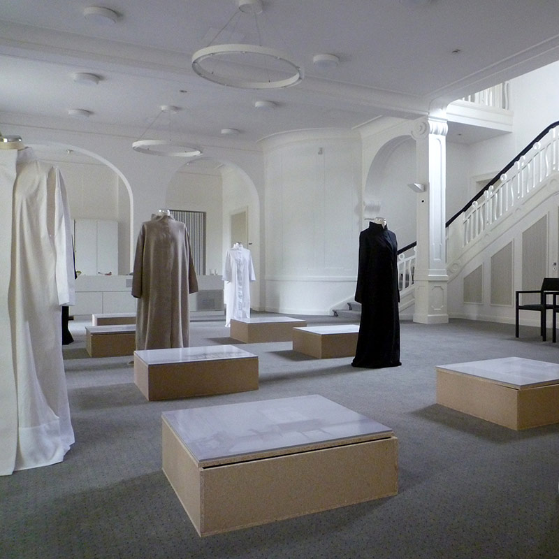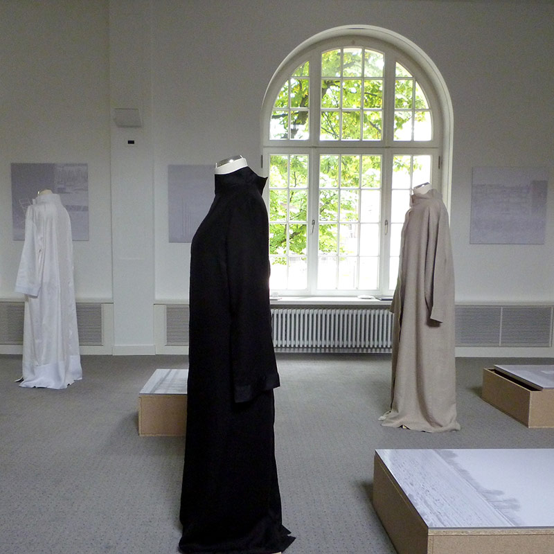 Dreiteilige Rauminstallation mit jeweils sieben Elementen: Die Gewänder, drapiert auf Schneiderpuppen, bestehen aus reinen Naturstoffen wie Seide, Leinen, Baumwolle oder Woll-Filz. Auf der Basis einer klassischen Mönchskutte wurden sie in Einzelanfertigung von Hand hergestellt und sowohl im Entwurf als auch im Material individuell gestaltet. Es werden weiße, schwarze und beige-graue Gewänder präsentiert.