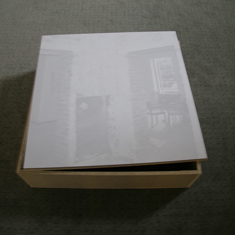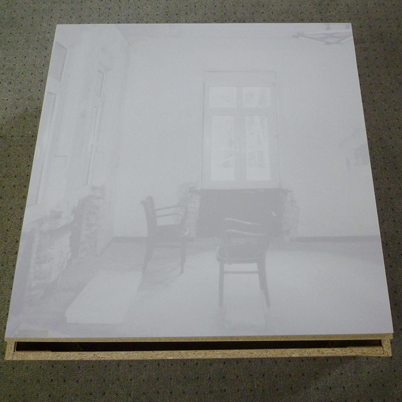 Zwischen den Gewändern, auf dem Boden arrangiert, befinden sich quadratische, nach oben hin offene Holzkästen im Format 80 x 80. Deren offene Seite ist jeweils mit einem Foto bedeckt, das - ebenfalls im Format 80 x 80 - auf Kapa-Platte fixiert ist. Die Fotos verschließen die Öffnungen der Kästen nur teilweise. Sie zeigen – in Unschärfe – Orte in Deutschland, Polen sowie den USA.